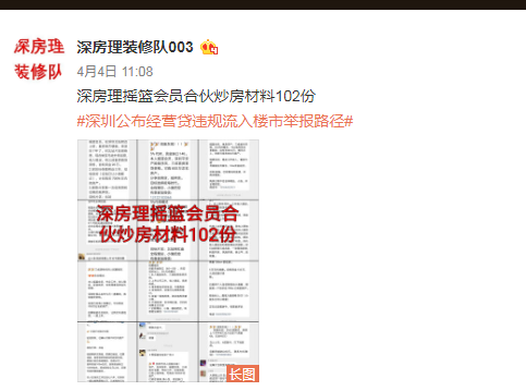 此前,網(wǎng)名為“深房理裝修隊(duì)003”的用戶,在微博上一直“連載”炒房客騰挪經(jīng)營貸購房等猛料,并在4月4日爆出“深房理”搖籃會(huì)員合伙炒房材料102份。被舉報(bào)的“深房理” 微博簡介為房產(chǎn)專家,擁有超過140萬粉絲。舉報(bào)者還爆料稱其有7個(gè)500人群,群成員加起來超過3000人。(中國證券報(bào))