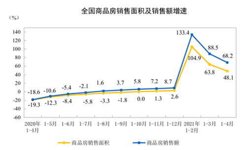 1—4月份,商品房銷售面積50305萬平方米,同比增長48.1%;比2019年1—4月份增長19.5%,兩年平均增長9.3%。其中,住宅銷售面積增長51.1%,辦公樓銷售面積增長20.0%,商業(yè)營業(yè)用房銷售面積增長16.3%。商品房銷售額53609億元,增長68.2%;比2019年1—4月份增長37.0%,兩年平均增長17.0%。其中,住宅銷售額增長73.2%,辦公樓銷售額增長31.9%,商業(yè)營業(yè)用房銷售額增長20.3%。