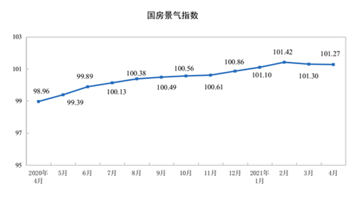 4月份,房地產(chǎn)開發(fā)景氣指數(shù)(簡稱“國房景氣指數(shù)”)為101.27。