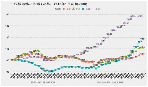 但進(jìn)入2021年1月以來,漲速有顯著的加速,一二線城市出現(xiàn)一波房價(jià)小陽春。其中2021年3月緯房核心指數(shù)的環(huán)比漲幅高達(dá)2.49%,為2018年1月以來的房價(jià)漲速最高值。