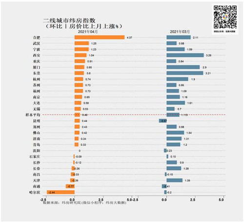 二線城市中,4月合肥、武漢、寧波、西安、重慶、廈門、東莞、杭州等城市房價(jià)環(huán)比漲速均相對較高。其中合肥、武漢、重慶漲速有所上升,其它城市漲速以下降為主。哈爾濱、長春、天津、長沙等區(qū)域代表性城市房價(jià)穩(wěn)中有降。