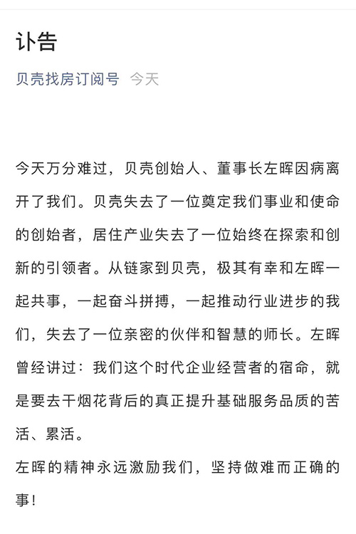房訊網(wǎng)訊 貝殼發(fā)布公告,公司創(chuàng)始人兼董事長左暉先生因疾病意外惡化于2021年5月20日去世。