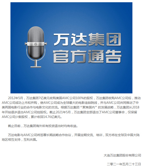 萬(wàn)達(dá)集團(tuán)退出AMC董事會(huì) 累計(jì)收回14.76億美元
