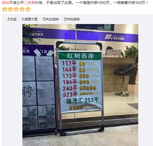 這是一張?jiān)谏缃幻襟w熱傳的照片。由于深圳早已實(shí)施了二手房成交參考價(jià),房產(chǎn)中介在對(duì)外公布時(shí)只能發(fā)布二手房成交參考價(jià)。為了展示房屋掛牌價(jià),中介們想出奇招:用榴蓮和香蕉代替貨幣計(jì)算單位,一個(gè)榴蓮代表1000萬元,一根香蕉代表100萬元!