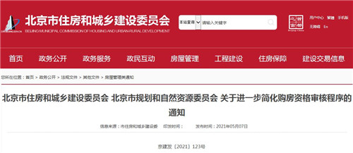 房訊網(wǎng)訊 5月7日,北京市住建委、市規(guī)自委聯(lián)合出臺《關(guān)于進(jìn)一步簡化購房資格審核程序的通知》,明確自2021年5月1日起,居民家庭購房資格通過聯(lián)網(wǎng)審核的,在申請不動產(chǎn)權(quán)登記受理環(huán)節(jié),不再核驗居民家庭購房資格證明材料,只收取《家庭購房申請表》《購房承諾書》原件。若購房家庭是通過互聯(lián)網(wǎng)辦理不動產(chǎn)登記的,《家庭購房申請表》和《購房承諾書》亦無需提交。