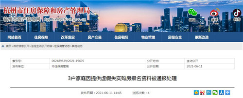 房訊網(wǎng)訊 6月11日,杭州市住保房管局發(fā)布通報,經(jīng)核查,“星合映公寓”“未來云帆城”兩個項目中有3戶購房家庭所提供的申報信息或報名材料存在虛假、失實情況,對3戶家庭作出“一年內(nèi)不再受理限購查檔申請”的通報處理。
