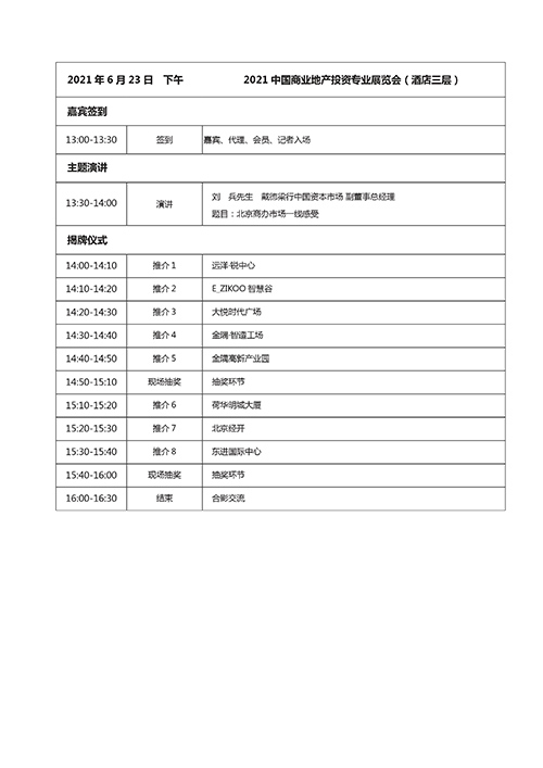 以下是2021中國(guó)商業(yè)地產(chǎn)投資專業(yè)展覽會(huì)議程,精彩盛會(huì),與您相約,不見不散!