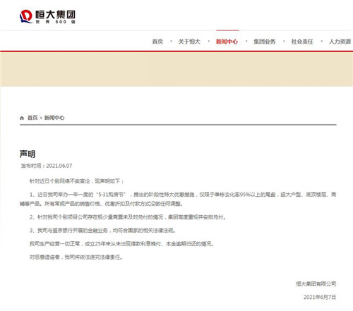 恒大重點對近日網(wǎng)上幾大熱點問題進行回應(yīng),一是近日公司舉辦一年一度的“5·31購房節(jié)”,推出的階段性特大優(yōu)惠措施,僅限于單棟去化率95%以上的尾盤,超大戶型、底頂樓層、商鋪等產(chǎn)品。所有常規(guī)產(chǎn)品的銷售價格、優(yōu)惠折扣及付款方式?jīng)]做任何調(diào)整。二是針對公司個別項目公司存在極少量商票未及時兌付的情況,集團高度重視并安排兌付。三是公司與盛京銀行開展的金融業(yè)務(wù),均符合國家的相關(guān)法律法規(guī)。