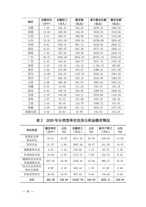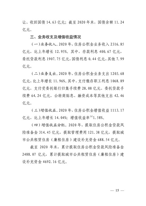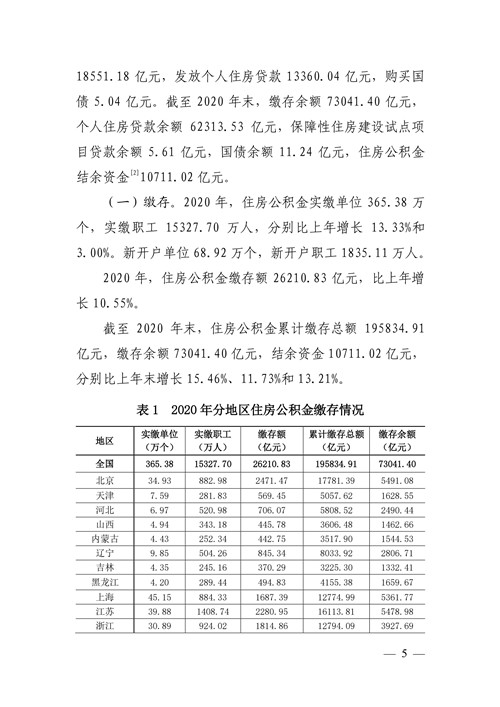 2020年,住房公積金繳存額26210.83億元,提取額18551.18億元,發(fā)放個(gè)人住房貸款13360.04億元,購(gòu)買(mǎi)國(guó)債5.04億元。截至2020年末,繳存余額73041.40億元,個(gè)人住房貸款余額62313.53億元,保障性住房建設(shè)試點(diǎn)項(xiàng)目貸款余額5.61億元,國(guó)債余額11.24億元,住房公積金結(jié)余資金10711.02億元。