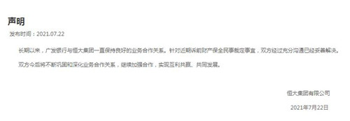 房訊網(wǎng)訊 7月22日,恒大集團(tuán)發(fā)布聲明,稱針對(duì)近期訴前財(cái)產(chǎn)保全民事裁定事宜,恒大集團(tuán)與廣發(fā)銀行雙方經(jīng)過(guò)充分溝通已經(jīng)妥善解決。雙方今后將不斷鞏固和深化業(yè)務(wù)合作關(guān)系,繼續(xù)加強(qiáng)合作,實(shí)現(xiàn)互利共贏、共同發(fā)展。