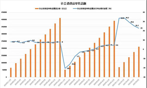 從市場(chǎng)端來(lái)看,隨著整體商業(yè)環(huán)境繼續(xù)回暖,消費(fèi)市場(chǎng)加快復(fù)蘇,餐飲等接觸式消費(fèi)明顯改善,實(shí)體零售店鋪經(jīng)營(yíng)繼續(xù)回升。上半年,社會(huì)消費(fèi)品零售總額211904億元,同比增長(zhǎng)23%,兩年平均增速為4.4%。