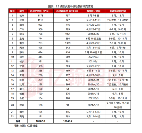 6月接近尾聲,試點(diǎn)集中供地的22城的首批集中供地已經(jīng)結(jié)束,部分城市的第二次供地也已經(jīng)結(jié)束。22城首次集中供地總成交金額超萬億,土地成交總建筑面積為1.08億平米,杭州以1178億元總成交金額居于首位,北京、南京、廣州、武漢、上海、重慶土地成交總金額均超500億元。