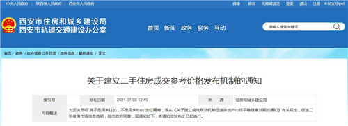 房訊網訊 7月8日,西安市住房和城鄉(xiāng)建設局發(fā)布《關于建立二手住房成交參考價格發(fā)布機制的通知》,要求西安市房產交易管理中心以住宅小區(qū)為單位,充分參考二手住房網簽成交價格、評估價格等因素,經調查分析,形成二手住房成交參考價格,在西安市住房和城鄉(xiāng)建設局官方網站、微信公眾號等網絡平臺發(fā)布。