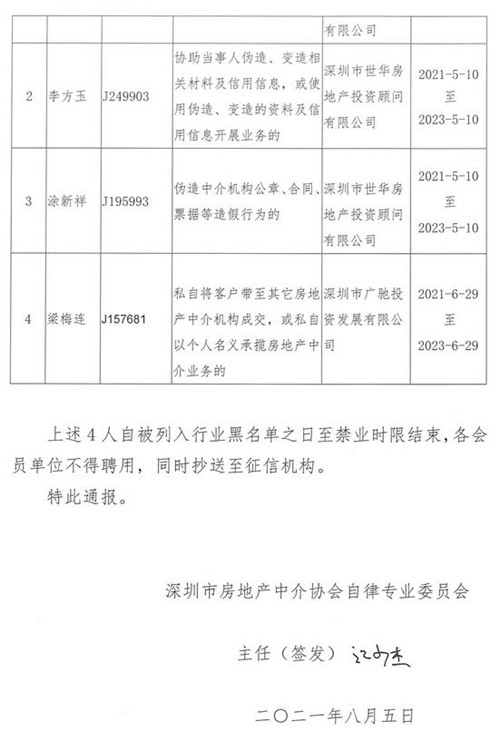 房訊網(wǎng)訊 8月11日,深圳市房地產(chǎn)中介協(xié)會(huì)發(fā)布關(guān)于胡偉等4名從業(yè)人員被列入“行業(yè)黑名單”的通報(bào)。