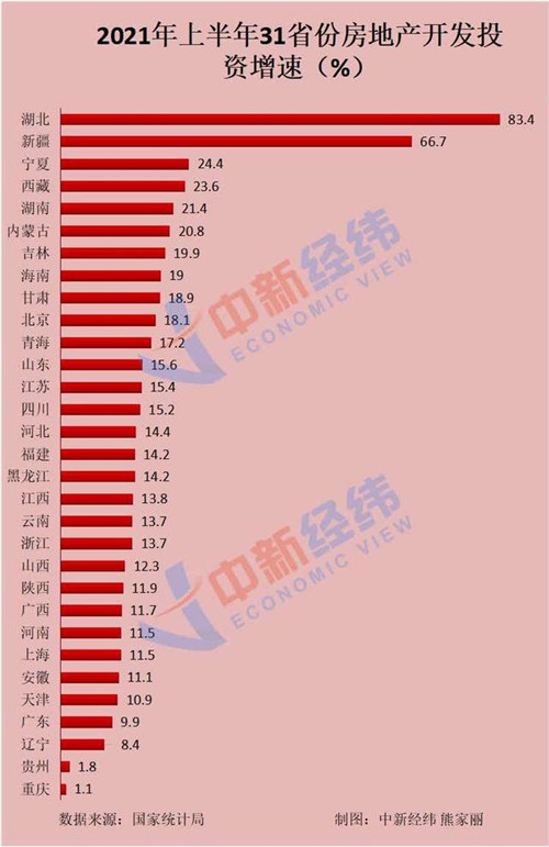 分省份來看,2021年上半年湖北、新疆、寧夏、西藏、湖南、內(nèi)蒙古、吉林、海南、甘肅、北京、青海、山東、江蘇、四川14省份房地產(chǎn)開發(fā)投資同比增速均超全國。其中,湖北以83.4%的增速位居第一,新疆以66.7%的增速名列第二,與排在第三的寧夏遠遠拉開差距。