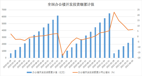 開(kāi)發(fā)投資上,凸顯出行業(yè)長(zhǎng)期發(fā)展的信心恢復(fù)。2021年1-6月,全國(guó)辦公樓開(kāi)發(fā)投資額為2910億元,同比2020年增長(zhǎng)6.7%,與2019年上半年(2815億元)相比略有增長(zhǎng)。