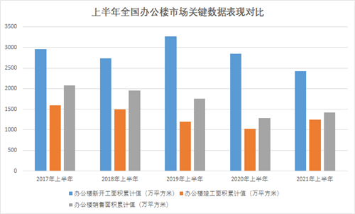 具體來(lái)看,2021年上半年,全國(guó)辦公樓行業(yè)穩(wěn)健復(fù)蘇,各項(xiàng)數(shù)據(jù)較去年同期有大幅回升,基本恢復(fù)到疫情前狀態(tài)。當(dāng)然這也與去年同期整體行業(yè)受疫情突然沖擊而出現(xiàn)基本面數(shù)據(jù)大幅下滑有關(guān)。