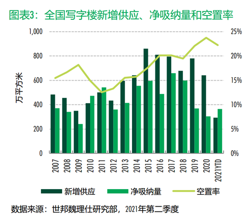 CBRE世邦魏理仕近日發(fā)布《2021年第二季度中國房地產(chǎn)市場(chǎng)報(bào)告》顯示,今年第二季度國內(nèi)主要城市寫字樓凈吸納量接近歷史峰值,同比2020年第二季度大幅增長436.7%。展望未來,世邦魏理仕預(yù)計(jì)下半年寫字樓凈吸納量將超過300萬平方米,并上調(diào)全年凈吸納量預(yù)測(cè)至660萬平方米。