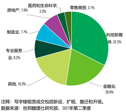 市場(chǎng)租賃成交類型來看,科技新媒體、金融業(yè)及專業(yè)服務(wù)業(yè)繼續(xù)擔(dān)當(dāng)主力需求引擎,貢獻(xiàn)租賃成交的33%、20%和8%。