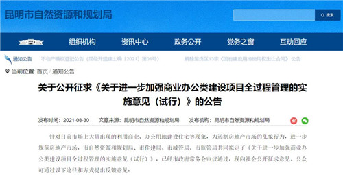 房訊網(wǎng)訊 針對目前市場上大量出現(xiàn)的利用商業(yè)、辦公用地建設(shè)住宅等現(xiàn)象,為遏制房地產(chǎn)市場的亂象行為,進(jìn)一步規(guī)范房地產(chǎn)市場,8月30日,昆明市自然資源和規(guī)劃局、市住建局、市城管局、市監(jiān)管局共同擬定了《關(guān)于進(jìn)一步加強(qiáng)商業(yè)辦公類建設(shè)項(xiàng)目全過程管理的實(shí)施意見(試行)》,已經(jīng)市政府常務(wù)會審議通過,現(xiàn)向社會公開征求意見。征求意見時間為8月31日至9月13日。