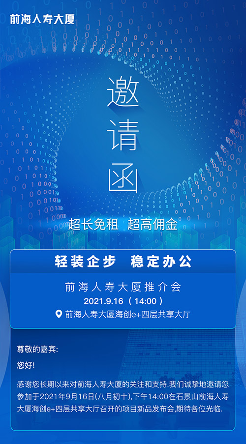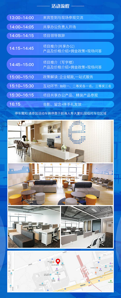 房訊網(wǎng)訊 9月16日下午,前海人壽大廈推介會(huì)將在項(xiàng)目4層海創(chuàng)e+共享大廳舉辦,誠(chéng)摯邀約北京渠道代理精英、選址企業(yè)代表蒞臨。項(xiàng)目方將就樓宇精裝辦公產(chǎn)品以及共享辦公產(chǎn)品海創(chuàng)e+進(jìn)行詳細(xì)的介紹,并分享項(xiàng)目配套熱點(diǎn)、優(yōu)惠政策、招商策略等內(nèi)容。
