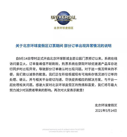房訊網(wǎng)訊 9月14日,北京環(huán)球度假區(qū)關于訂票期間部分訂單出現(xiàn)異常情況發(fā)布說明,自9月14日零時正式開啟北京環(huán)球影城主題公園門票預訂以來,系統(tǒng)在線訪問量巨大,訂單量峰值不斷刷新,購票系統(tǒng)在獲取環(huán)球優(yōu)速通產品庫存進行同步時出現(xiàn)異常,導致部分訂單確認時出現(xiàn)問題。對于這一情況帶來的不便,我們致以誠摯歉意。