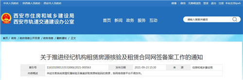 房訊網訊 9月23日,西安市住建局發(fā)布《關于推進經紀機構租賃房源核驗及租賃合同網簽備案工作的通知》,明確9月房地產經紀機構受托發(fā)布住房租賃房源信息的,須通過“西安市房地產經紀機構開戶和二手房交易管理系統(tǒng)”進行房屋權屬核驗及備案獲取房源核驗碼。未經交易系統(tǒng)房屋權屬核驗及備案獲取房源核驗碼的房源,各網絡信息平臺不得發(fā)布。