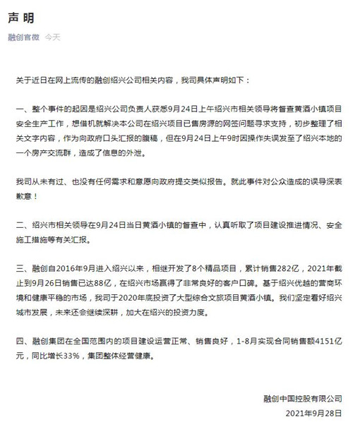 房訊網(wǎng)訊 9月28日,融創(chuàng)中國官微發(fā)布聲明,就近日在網(wǎng)上流傳的融創(chuàng)紹興公司相關(guān)內(nèi)容進(jìn)行回應(yīng)稱,公司從未有過、也沒有任何需求和意愿向政府提交求助報(bào)告,融創(chuàng)集團(tuán)在全國范圍內(nèi)的項(xiàng)目建設(shè)運(yùn)營正常、銷售良好,1-8月實(shí)現(xiàn)合同銷售額4151億元,同比增長33%,集團(tuán)整體經(jīng)營健康。