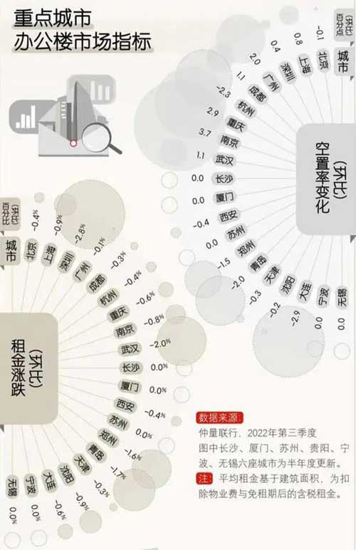 從前三季度的寫字樓市場來看,除頭部城市表現(xiàn)出企穩(wěn)向好的態(tài)勢以外,其他重點(diǎn)城市受制于經(jīng)濟(jì)波動和疫情影響,辦公樓租賃擴(kuò)張受阻,市場承壓。