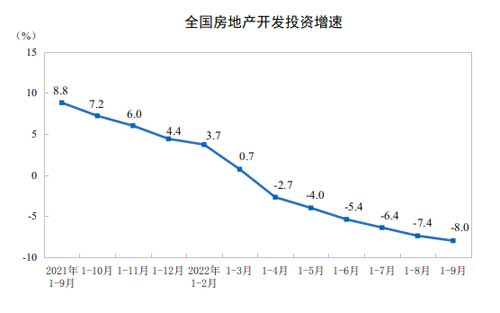1—9月份,全國房地產(chǎn)開發(fā)投資103559億元,同比下降8.0%;其中,住宅投資78556億元,下降7.5%。