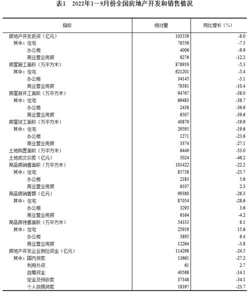 表1 2022年1—9月份全國房地產(chǎn)開發(fā)和銷售情況