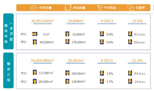 2、為提振去化和挽留客戶,部分項(xiàng)目業(yè)主繼續(xù)下調(diào)租金,使得全市甲級及乙級寫字樓市場平均租金環(huán)比均明顯下降。