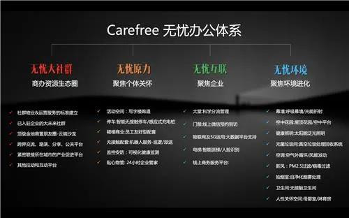 據房訊指數觀察,目前多家頭部企業(yè)已經積極擁抱數字化,推出智慧服務平臺,包括中海商務APP、華潤CR Union智慧云辦公平臺、大悅城COFFICE、金地商置Carefree辦公體系等。其中金地商置Carefree體系包含無憂大社群——企業(yè)資源生態(tài)圈、無憂原力——聚焦個體關懷、無憂互聯(lián)——聚焦企業(yè)生長、無憂健康——聚焦環(huán)境凈化四個模塊,26個細項。