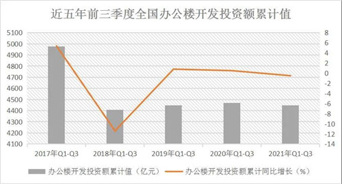 開發(fā)投資上,行業(yè)整體凸顯出理性發(fā)展的態(tài)勢,自2018年前三季度的辦公樓開發(fā)投資額大幅下滑之后,已經連續(xù)三年同期保持在1個百分點內的波動。2021年1-9月,全國辦公樓開發(fā)投資額為4446億元,較去年同期減少0.5%。