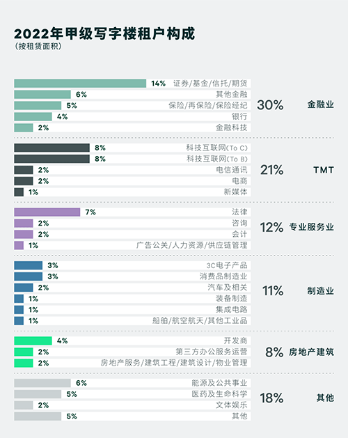 過去三年,非銀行金融和科技互聯(lián)網(wǎng)兩大領(lǐng)域的創(chuàng)新發(fā)展是北京辦公需求的“雙引擎”,使得金融業(yè)和TMT合計(jì)租賃面積占比三年間提升4.2個(gè)百分點(diǎn)至50.8%。從2022年租賃成交看,金融業(yè)中的證券、基金和TMT中的軟件開發(fā)、人工智能、大數(shù)據(jù)等賽道保持活躍,而高精尖制造業(yè)、升級型傳統(tǒng)制造業(yè)、以及醫(yī)藥及生命科學(xué)等產(chǎn)業(yè)類租戶則逆勢布局。