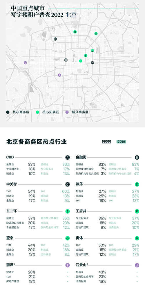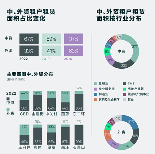 中資金融、TMT、專業(yè)服務(wù)等行業(yè)企業(yè)近年在京不斷擴(kuò)張,且對辦公品質(zhì)的要求不斷提升,逐步成為北京甲級寫字樓租賃需求的中流砥柱,其中中資租戶在金融街、東二環(huán)、奧體和各新興商務(wù)區(qū)更是占有絕對優(yōu)勢。