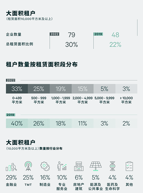 過去三年,進(jìn)入“萬平級”俱樂部的甲級寫字樓租戶數(shù)量從48上升至79,總租賃面積占比從22%上升至30%,這一方面要?dú)w功于金融、TMT和專業(yè)服務(wù)等行業(yè)頭部中資企業(yè)的發(fā)展壯大,另一方面受益于過去三年的供應(yīng)潮,各類大型企業(yè)獲得更多擴(kuò)大、騰挪、整合辦公空間的機(jī)會。