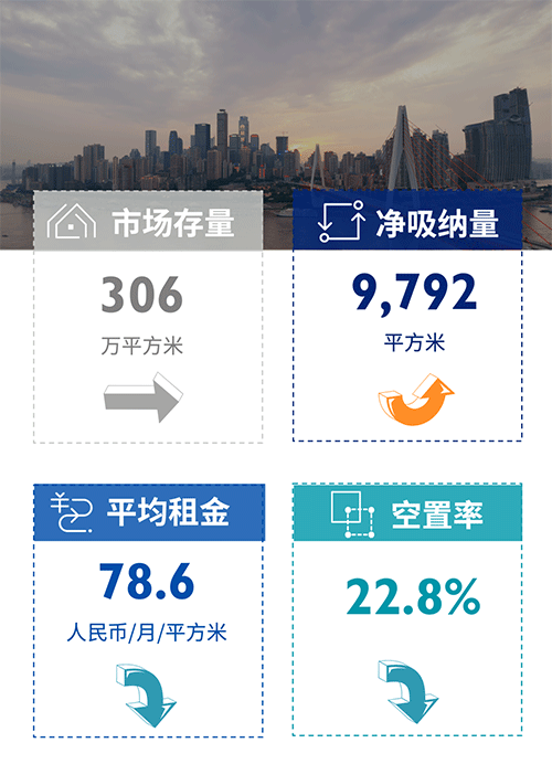 2022年第三季度,重慶甲級寫字樓市場未有新增項目入市,全市甲級寫字樓市場總存量維持在306萬平方米;重慶甲級寫字樓市場新租擴租需求放緩,受經(jīng)濟下行及企業(yè)降本增效戰(zhàn)略調整的影響,搬遷需求于本季度有所釋放,使得凈吸納量較上季度明顯提升;