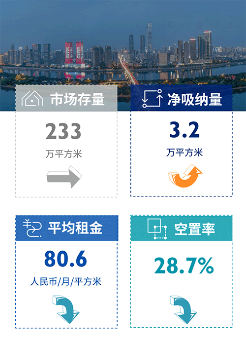 本季度無新增供應,市場進入存量去化階段,長沙甲級寫字樓空置率環(huán)比小幅下降至28.7%;為穩(wěn)固現(xiàn)有租戶和吸引優(yōu)質客戶,部分業(yè)主采用租金優(yōu)惠的租賃策略,使得長沙甲級寫字樓市場平均租金環(huán)比微降;
