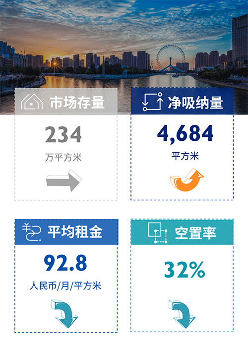 因本季度無新增供應入市,天津甲級寫字樓市場進入存量去化階段,空置率環(huán)比上季度小幅下降0.2個百分點至32%;部分商圈的項目業(yè)主采取下調租金策略以維持項目出租率,使得天津甲級寫字樓市場平均租金下降至92.8元每平方米每月;