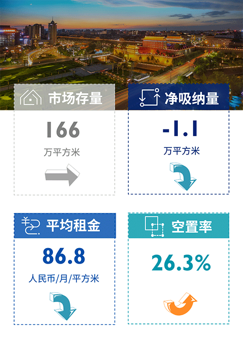 2022年至2025年期間預計將有約72萬平方米的新增供應交付進入西安甲級寫字樓市場,其中約20萬新增供應預計將于第四季度交付入市,全市空置率及平均租金或將繼續(xù)承壓。