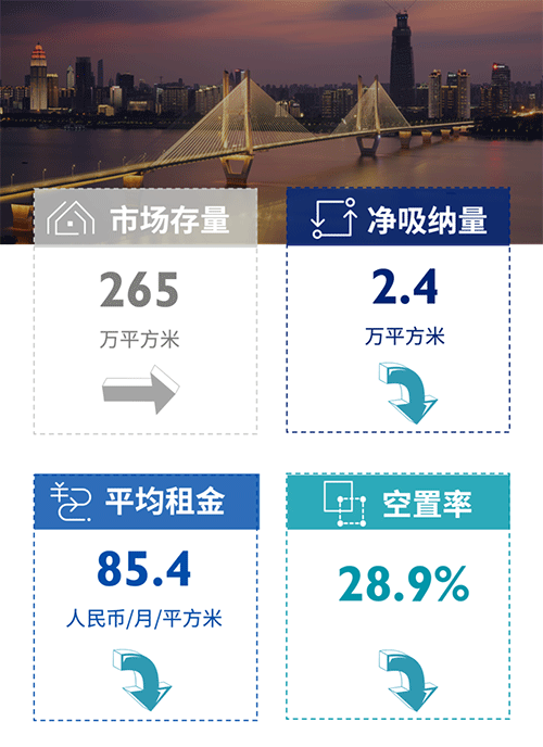 全市甲級寫字樓市場空置率微降0.3個百分點至22.8%;由于市場整體租賃需求放緩,去化周期較長,部分項目業(yè)主采用靈活優(yōu)惠租賃措施導致全市平均租金繼續(xù)下探,于本季度錄得78.6元每平方米每月。