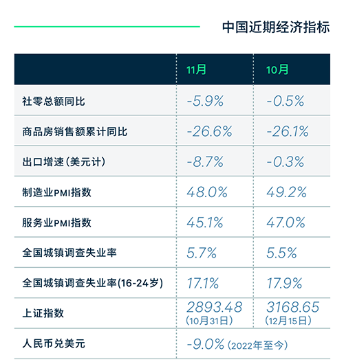 在防疫政策調(diào)整的同時(shí),中國(guó)近期經(jīng)濟(jì)下行壓力進(jìn)一步增大。11月制造業(yè)PMI指數(shù)降至48%,連續(xù)兩個(gè)月位于榮枯線之下,社零總額同比下降5.9%,降幅相比10月明顯擴(kuò)大,而地方政府財(cái)政收支也同樣面臨較大壓力。