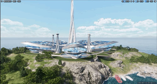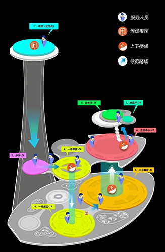 本次活動最大的亮點就是采用了線上元宇宙形式。元宇宙海島空間51ISLAND整體呈五瓣花造型,每個花瓣都是一個5.1萬平的獨立場館。共包含A、B、C、D、E五個館,本次活動采用了元宇宙A館,共有上下三層,劃分了七大功能區(qū),包括序廳、1號展區(qū)、2號展區(qū)、會議中心、發(fā)布廳、貴賓廳以及活動廳。