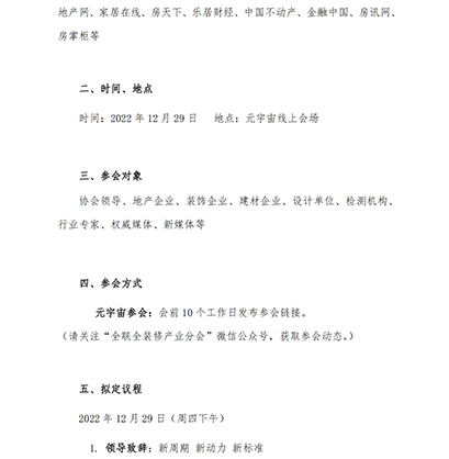 在此背景下,2022第六屆全裝修產(chǎn)業(yè)領袖峰會暨內裝工業(yè)化發(fā)展論壇將于12月29日舉辦,本屆峰會以“新周期?新動力 新標準”為主題,將采用線上元宇宙方式,與行業(yè)專家,業(yè)內領袖一起探討全裝修行業(yè)的新問題、新需求、新動向,共同推進中國房地產(chǎn)全裝修行業(yè)走綠色、舒適、健康發(fā)展之路。