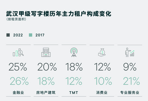 租賃面積3,000平方米及以上的大面積租戶數(shù)量在五年內(nèi)成倍增長(zhǎng),從2017年的22家上升至2022年的74家,租賃面積占比上升10個(gè)百分點(diǎn)至30%。大面積租戶的增長(zhǎng)主要來(lái)自于金融業(yè)、房地產(chǎn)建筑和TMT行業(yè)的中資頭部企業(yè)在武漢設(shè)立區(qū)域總部,形成總部經(jīng)濟(jì)效應(yīng),持續(xù)推動(dòng)大面積租賃去化。