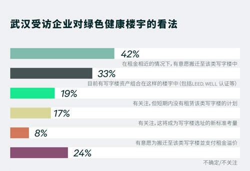 在本次調(diào)查中,超過(guò)七成的武漢受訪企業(yè)不同程度關(guān)注綠色樓宇,42%的企業(yè)在租金相近情況下愿意搬至綠色樓宇,已有33%的受訪企業(yè)目前正在使用綠色樓宇。8%武漢受訪企業(yè)表示愿意為綠色樓宇支付租金溢價(jià)。