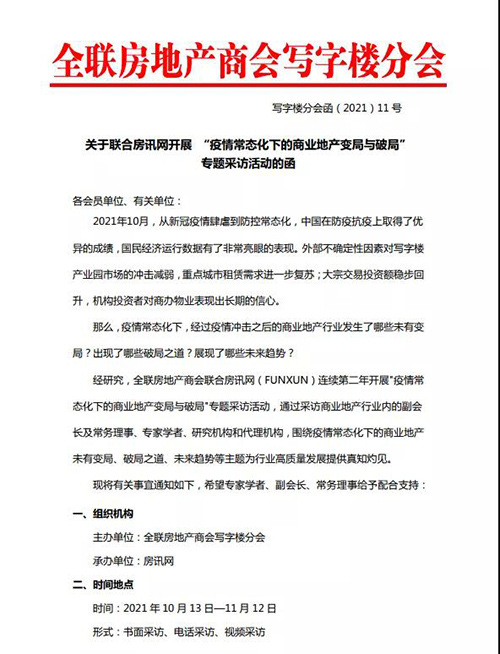 10月13日起,全聯(lián)房地產(chǎn)商會(huì)聯(lián)合房訊網(wǎng)(FUNXUN),再度開展"中國房地產(chǎn)50人"專題采訪行動(dòng),包括新商辦50人、新園區(qū)50人專題采訪行動(dòng),通過采訪商業(yè)地產(chǎn)行業(yè)內(nèi)的副會(huì)長及常務(wù)理事、專家學(xué)者、研究機(jī)構(gòu)和代理機(jī)構(gòu),采集行業(yè)意見,聆聽大咖聲音,揭秘疫情防控常態(tài)化下寫字樓產(chǎn)業(yè)園市場現(xiàn)狀,探尋行業(yè)創(chuàng)新發(fā)展路徑,揭幕中國商業(yè)地產(chǎn)高質(zhì)量發(fā)展的下一個(gè)十年。