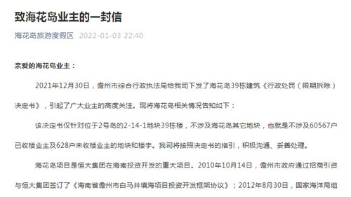房訊網(wǎng)訊 1月3日夜間,恒大童世界集團在官微發(fā)布《致;◢u業(yè)主的一封信》,稱2021年12月30日,儋州市綜合行政執(zhí)法局給我司下發(fā)了;◢u39棟建筑《行政處罰(限期拆除)決定書》,引起了廣大業(yè)主的高度關(guān)注。