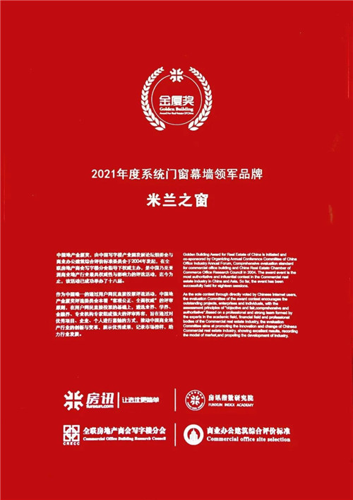 此次榮獲中國地產(chǎn)金廈獎(jiǎng)——“2021年度系統(tǒng)門窗幕墻領(lǐng)軍品牌”,離不開各界對(duì)米蘭之窗的認(rèn)可與支持。榮譽(yù)與責(zé)任并行,未來米蘭之家將持續(xù)致力于樹立中國系統(tǒng)門窗行業(yè)標(biāo)桿,引領(lǐng)行業(yè)發(fā)展,為推動(dòng)中國房地產(chǎn)良好發(fā)展作出更大的貢獻(xiàn)。
